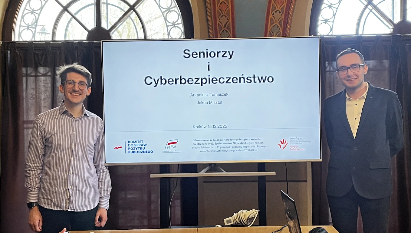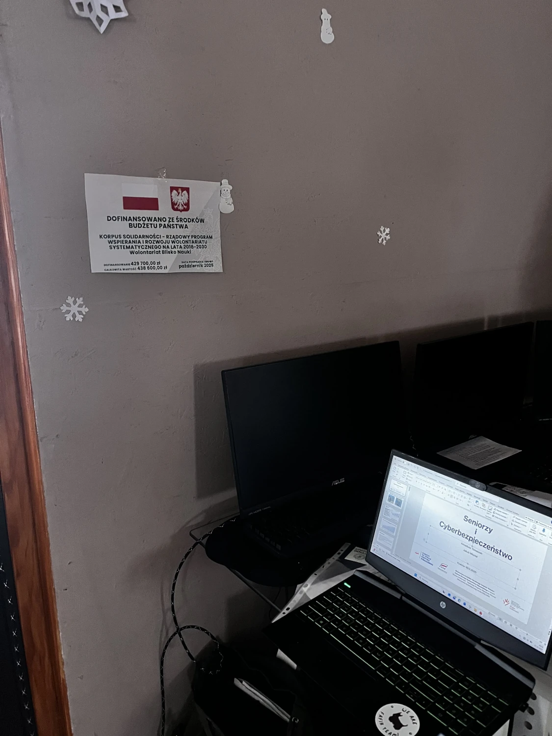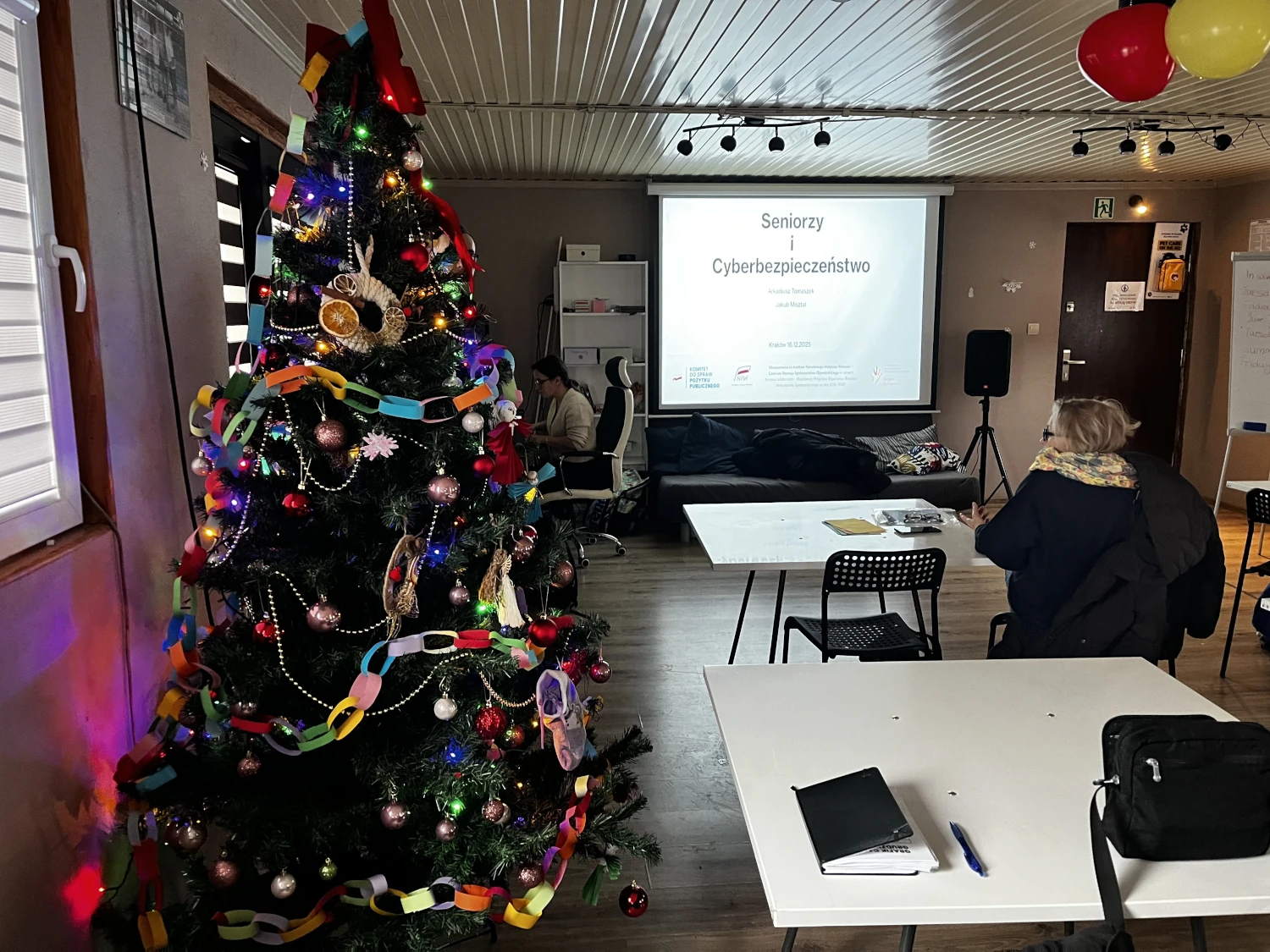 Kolejnym, kluczowym elementem projektu były praktyczne warsztaty, które zorganizowaliśmy w krakowskich Centrach Aktywności Seniora – CAS Willa Decjusza oraz CAS Krakowskie Wodne Ochotnicze Pogotowie Ratunkowe. Spotkania te stały się przestrzenią do otwartej dyskusji, wymiany doświadczeń oraz przekazywania konkretnych, praktycznych wskazówek dotyczących bezpieczeństwa w sieci. Seniorzy mieli okazję dowiedzieć się, jak rozpoznawać zagrożenia i jak świadomie korzystać z narzędzi, które oferuje współczesna technologia.